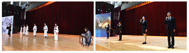 中华传统经典诵读会中,八篇凝聚古人智慧的经典片段、八种荡气回肠的澎湃激情、八段生气灵动的精彩演绎带来的是在场师生身临其境的深切感悟。学生会清灵悦耳的诵读向我们诉说了《诗经》的历史底蕴;湖光鹭影诗社带来的《周易》向我们描绘了宇宙间万事万物;特邀组织知语轩为我们讲述《声律启蒙》清新别致,超凡脱俗的美,带我们领略其卷帙浩繁;夜未央汉服社用其清脆动听的嗓音吟诵《千字文》,告诉大家心境坦然,方可无愧人生;季风配音社诵读的《大学》论述了先秦儒家道德修养理论,将儒家修身治国平天下的思想展现得淋漓尽致;图管会通过《论语》向大家展现了孔子因材施教、诲人不倦的可贵精神;天印读书会朗诵的“万经之王”《老子》采用师生问答的形式,体现了道家内容的博大精深;天印之声广播台带来的《庄子》反映了庄子的批判哲学、艺术、美学、审美观,显示了古代圣哲关于文学、美学、艺术、审美的智慧结晶。