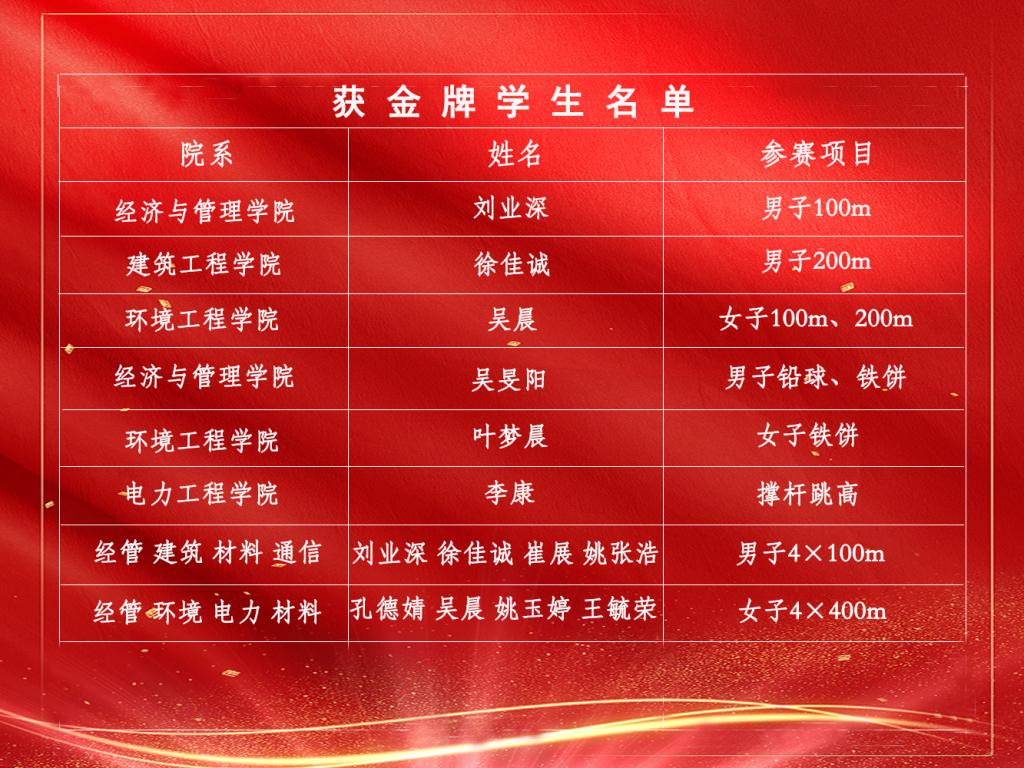 我校代表队由领队、体育部李海燕,教练员孟文、乔延宾、黄昕以及各院选拔的12名男运动员和8名女运动员组成。队员们备赛期间坚持每周3到6次的高强度训练,通过三次南京高校大学生田径运动会和三次全国大学生田径锦标赛的磨练,参赛前队员的竞技能力和心理素质都已达到非常理想的状态。在比赛中,共夺得10枚金牌、6枚银牌、3枚铜牌,位列金牌榜榜首。主教练孟文老师获江苏省十九届运动会优秀教练员殊荣。