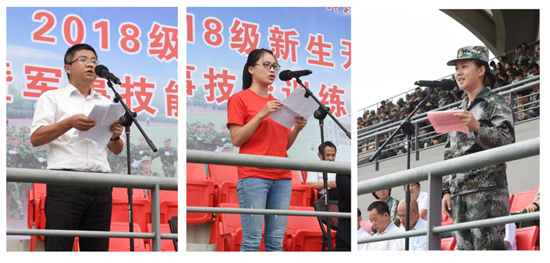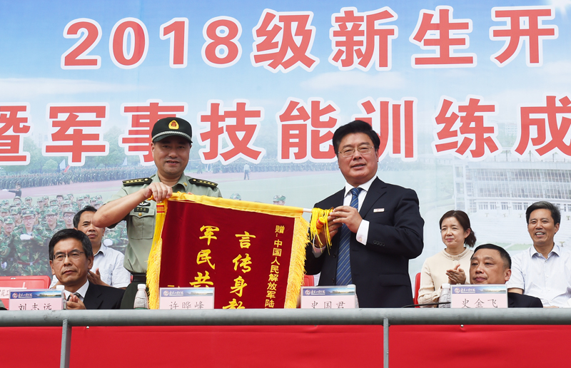 在热烈的掌声中,党委书记史国君向军训承训单位赠送锦旗表达谢意。党委副书记、纪委书记刘志远宣读了2018级新生军训表彰决定,对在军训工作中取得优异成绩的先进集体和个人进行表彰。