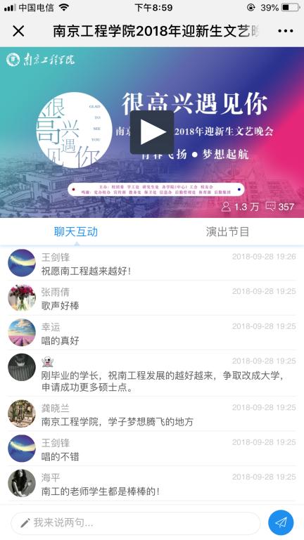 本场晚会采用全程网络直播的形式,累计观看人次达17563人次之多,评论近3000条。晚会集歌唱、舞蹈、朗诵、器乐、视频于一体,形式多样,内容丰富,让师生充分感受到了凯发对6000多名新同学真诚的祝福。逐梦远方,南工程就是同学们放飞梦想的土壤!衷心祝愿2018级新同学们在大学四年里,用最真的自我绽放耀眼光芒,在美丽的天印湖畔开启筑梦远航的新征程!