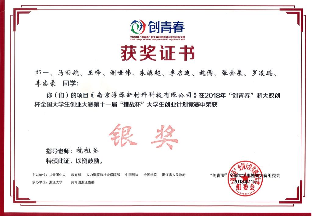 10月31日—11月3日,2018年“创青春”全国大学生创业大赛终审决赛在浙江大学举行,我校材料凯发选送的《南京浮源新材料科技有限公司》(指导教师:杭祖圣,负责人:邹一)喜获创业计划赛银奖,这是我校继获2014年“创青春”全国大学生创业大赛铜奖以来的又一突破。