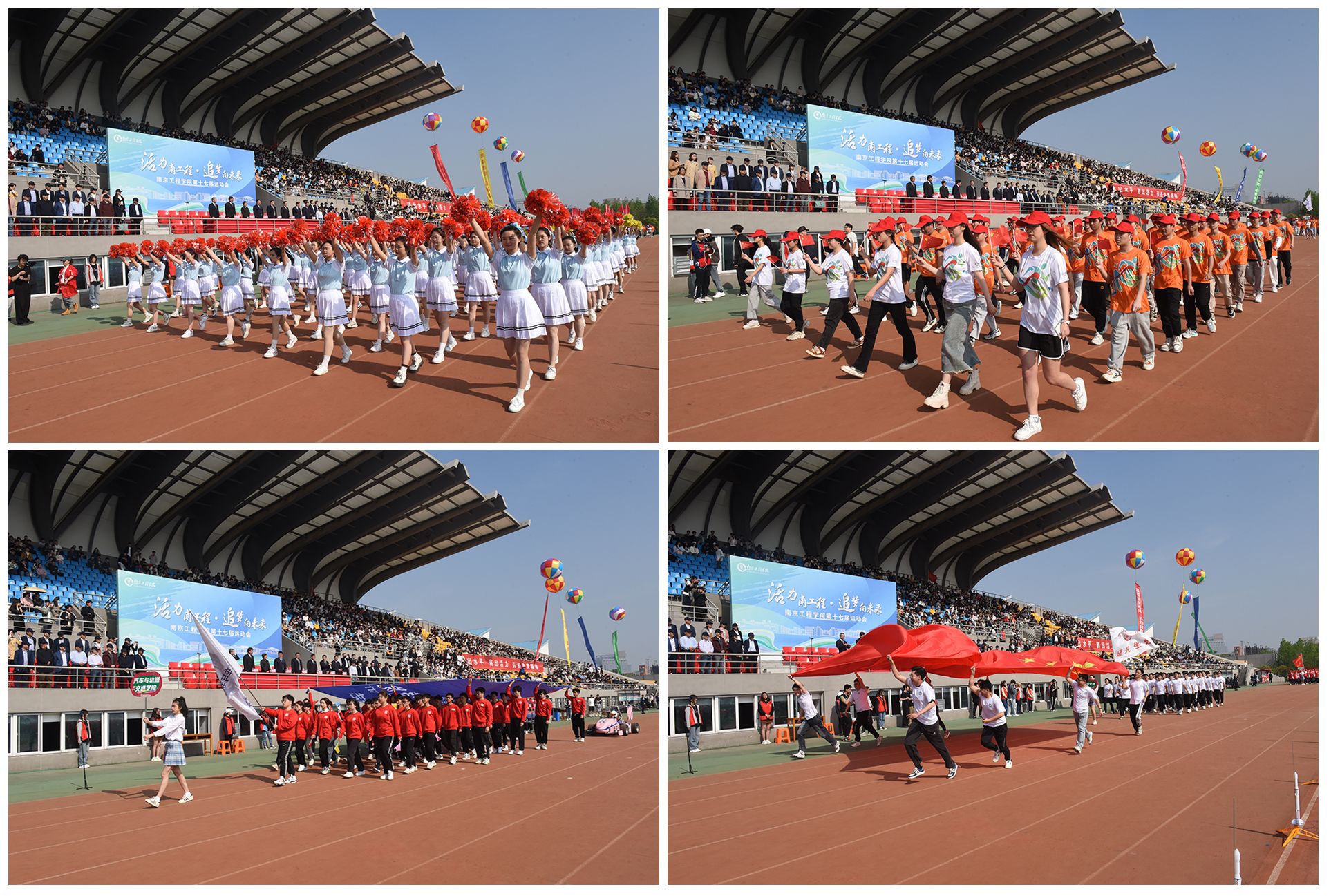 伴随着激昂的运动员进行曲,国旗队、花球队、彩旗队,裁判员方阵、各学院运动员方阵、志愿者方阵迈着铿锵整齐的步伐,喊着嘹亮有力的口号,以昂扬饱满的精神状态依次通过主席台。各方队进行了独具特色的风采展示,别出心裁的标语口号、丰富多彩的方阵变换、创意无限的道具展示或舞蹈表演……充分展现了我校师生昂扬向上的精神风貌,赢得了现场师生的阵阵掌声。