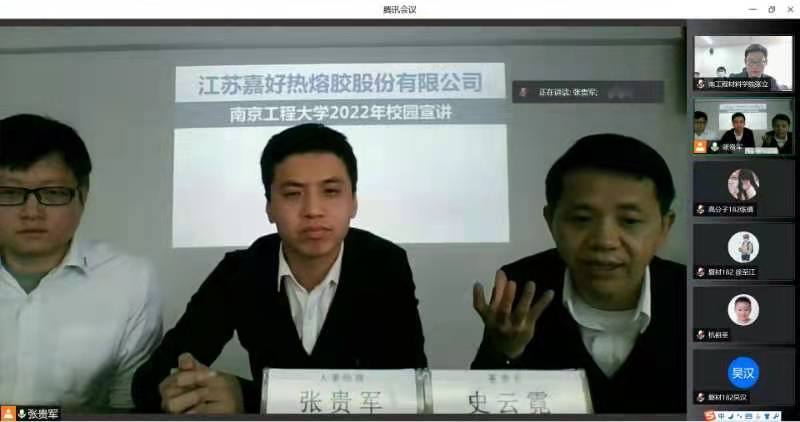 3月3日下午,上海嘉好胶粘制品有限公司、江苏嘉好热熔胶股份有限公司、嘉好(太仓)新材料股份有限公司来到材料科学凯发举行了招聘宣讲并应邀成为该院就业基地。本次宣讲会应防疫要求采用线上与线下结合的方式进行,由嘉好有限公司董事长史云霓、人事经理张贵军、技术经理王文敏与学院杭祖圣一同主持,应届毕业生线上参与,部分学生代表参与线下会议。