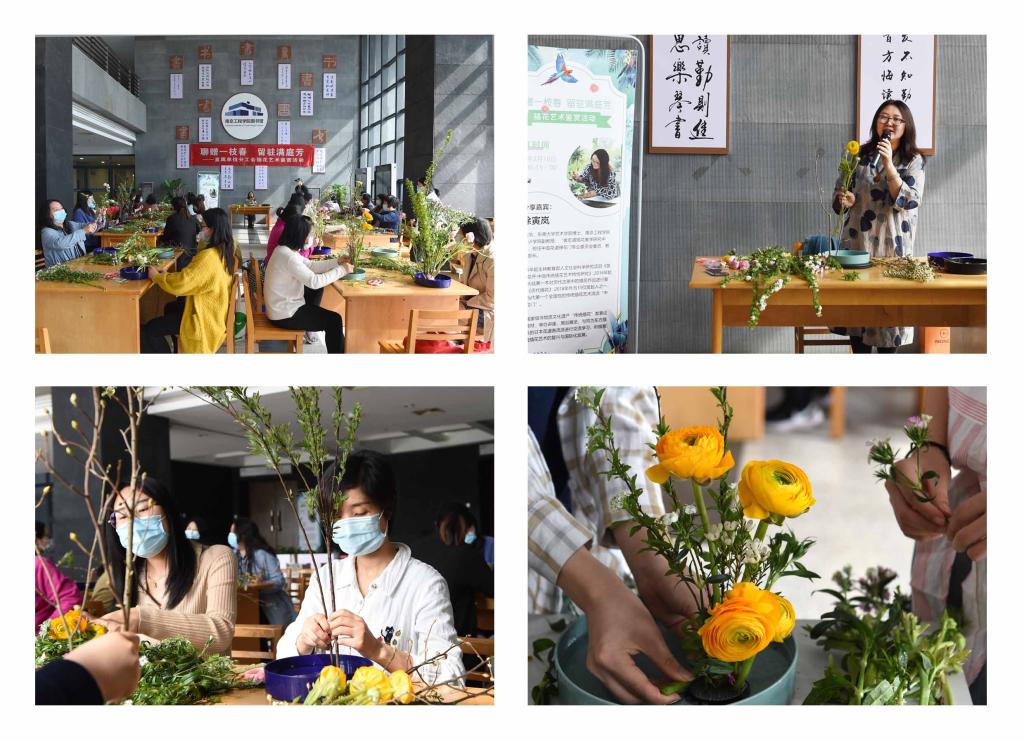 传统插花2008年入选我国国家级非物质文化遗产名录,具有很高的观赏性、艺术性和社会价值,传递美的同时,也传递向上的力量。活动邀请中国花道禅花门专业委员会委员、“袁宏道插花美学研究中心”主任、我校艺术与设计学院徐寅岚老师为女教职工讲授传统插花理论、传授传统插花技艺。“学习传统插花是为了什么?为了让我们感知天人合一的意境、感知生命的力量和生命的绚烂,拥有更强的感知力和积极的生活态度”。老师们在徐老师图文并茂的理论讲解和手把手的实践教学中,学到了中国插花艺术源远流长的发展史和艺术价值,也学到了花卉挑选、色彩搭配以及插花技法。经过大家的巧手,每朵花、每片叶、每根枝条都被赋予了新的生命,一朵朵独立的花和枝叶逐渐形成一盆盆层次分明、错落有致、造型各异的花艺作品。老师们兴趣盎然地分享着自己的作品,沉浸在花朵的芬芳与美丽之中,活动现场好似“一园春色”。