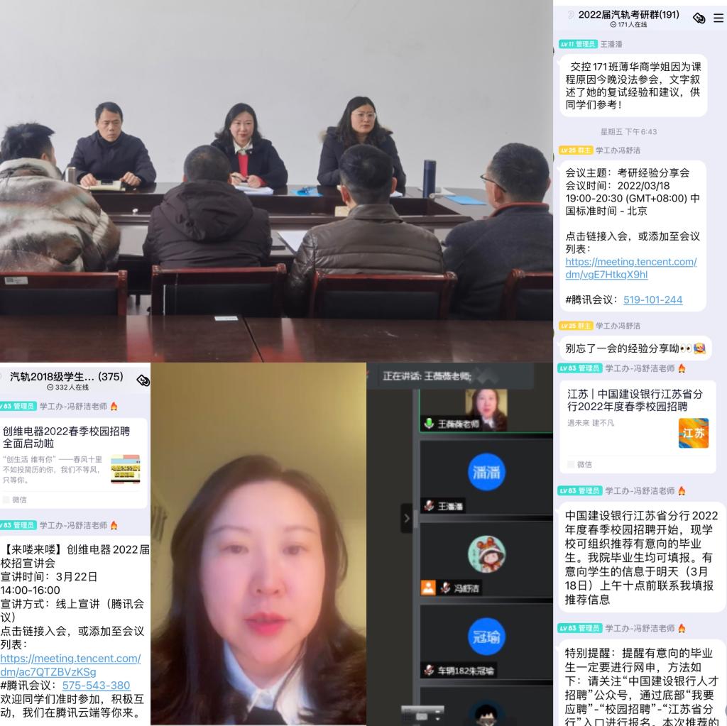 分层分类,给予个性指导。在掌握考研学生信息的基础上多方动员力量,学院组织了研究生复试“云上”经验分享会,邀请往届学长分享心得,为准备复试的毕业生提供信息支持,学院党委书记王薇薇全程参加了分享会,认真聆听了同学们分享的经验后向正在积极备战研究生复试的同学们提出了三点期望,一是坚定自信,保持良好的心态;二是做足充分准备,保证万事俱备;三是全力以赴,争取最好成绩,同时学院也会继续跟进同学们的情况,尽最大可能为同学们创造复试的良好环境。针对就业重点人群,积极开展就业指导和帮扶,提供企业介绍、岗位推荐、简历分析、心理辅导、签约指导等一条龙就业服务工作,力促毕业生顺利就业。