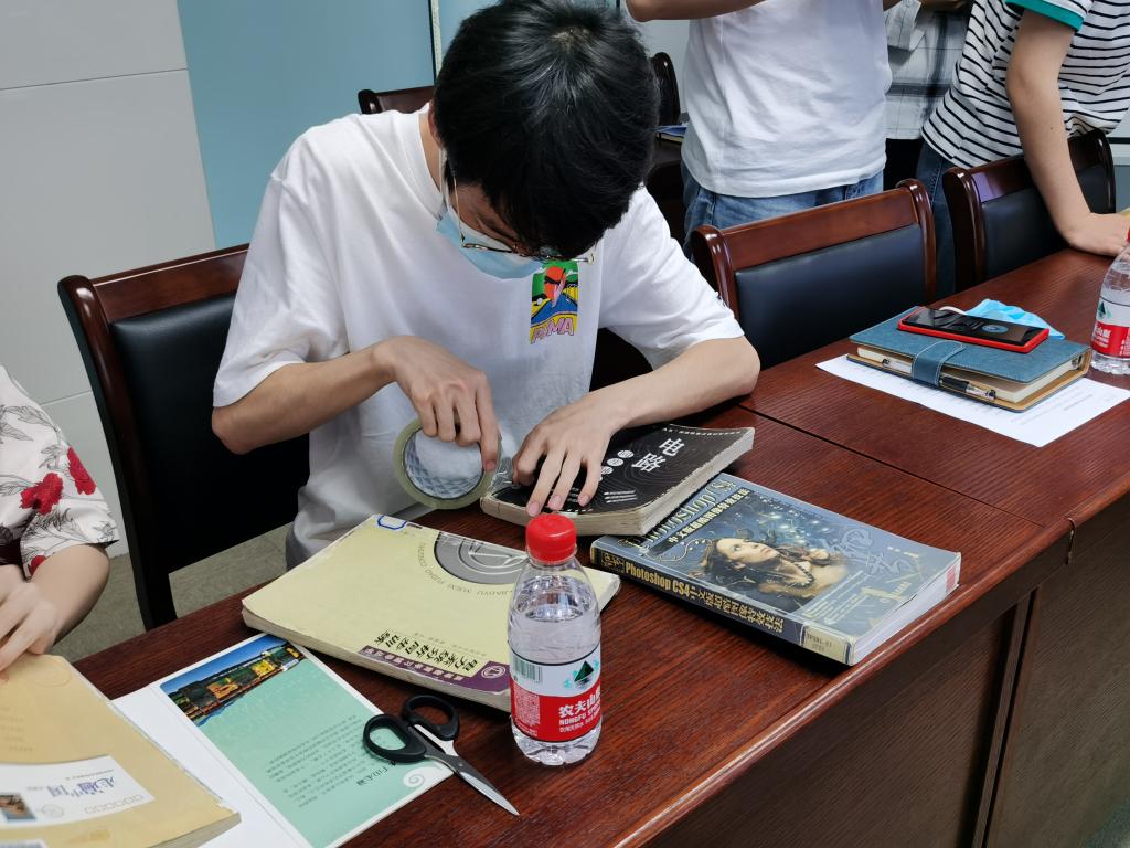 分享馆员故事之后,同学们在图书馆工作人员的带领下,体验了一次破损图书修补工作。“一直以来,馆藏书籍承载文化,传播知识,是全校师生的精神食粮,书本的频繁借阅难免会产生一些破损,越是受欢迎的书越容易‘受伤’。”图书馆读者服务部沈红茹老师从一本书的结构讲起,向大家普及了图书修补的基本流程,同学们认真聆听、虚心请教、细致操作,一本本破旧污损的图书在同学们手中再获新生。“总以为在图书馆工作就是坐着看看书,体验了才知道,图书修补也只不过是图书馆众多繁杂工作中的一种”。同学们不仅在修补过程中进一步体验了馆员文化、培养了劳动精神,更是从中感悟到爱书护书、文明阅读是每一名读者应该具备的品质。“这次活动让我们意识到,保护书籍重要的不仅在于修补,更需要在平时养成良好的借阅习惯,从根本上降低图书的破损率,延续文献资源的使用价值。”社保191班杨坤同学感慨道。